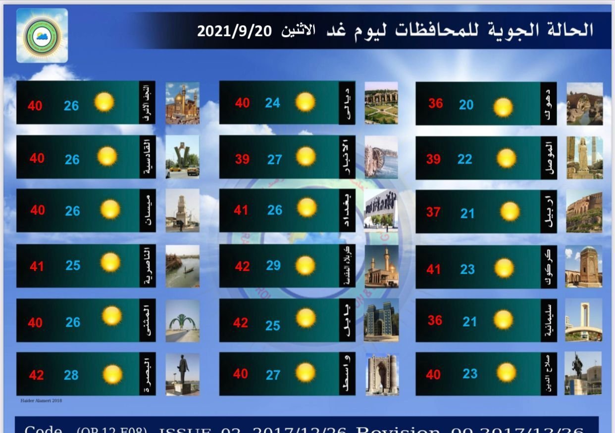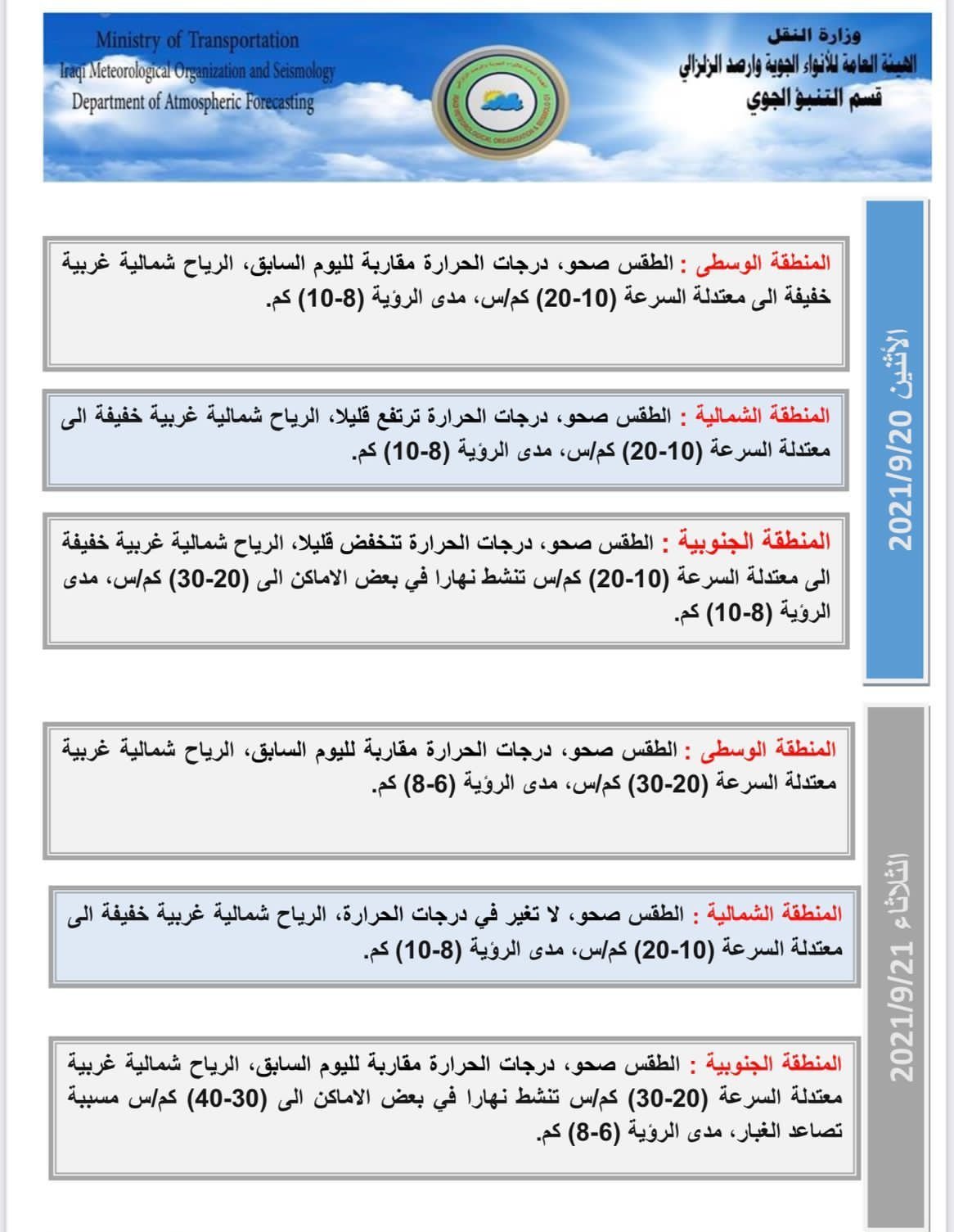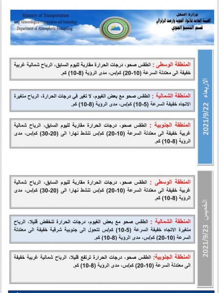 أعلنت هيئة الانواء الجوية، اليوم الاحد، عن حالة الطقس في البلاد للأسبوع الحالي، فيما توقعت ارتفاع بدرجات الحرارة مع تصاعد غبار الثلاثاء المقبل.