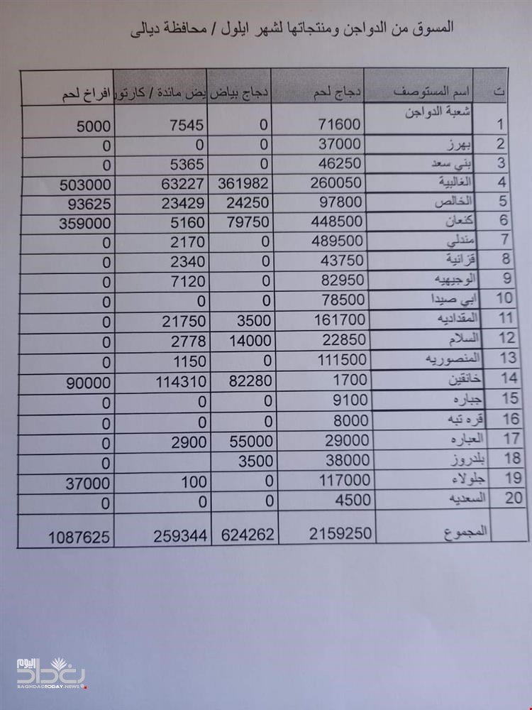 حصلت وكالة على وثيقة رسمية صادرة عن المستشفى البيطري في ديالى تظهر بالارقام حجم ما جرى تسويقه من منتوجات الدواجن خلال شهر ايلول الجاري، كاشفة عن تسويق اكثر من مليوني ومئة الف دجاجة لحم واكثر من 620 الف دجاجة لحم ونحو 260 الف كارتون بيض واكثر من مليون من افراخ اللحم.وقال احد منتجي الدواجن في ديالى يوسف الزيدي في حديث لصحفي،ان "3 اسباب دفعت لانتعاش تسويق منتوجات الدواجن في ديالى خلال 2021 بمعدلات ربما هي الاعلى بعد 2003 ابرزها احتواء الامراض الفتاكة من قبل المستشفى البيطري وسرعة التفاعل مع اي حالة بالاضافة الى زيادة خبرة اصحاب الحقول واعتمادهم اطر السلامة لمنع وصول الامراض".واضاف الزيدي،ان" قطاع الدواجن في ديالى يوفر فرص عمل تصل الى 5 الاف وربما اكثر وهي تحقق الاكتفاء في المحافظة ويصدر اكثر من 60% من الانتاج الى اسواق 8 محافظات عراقية ومنها بغداد".![]()