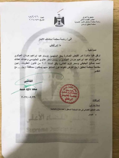 نشر مصدر صحفي بالوثيقة، أمراً بالقبض من محكمة تحقيق الرمادي بحق خمسة من المشاركين في مؤتمر “الدعوة إلى التطبيع”.