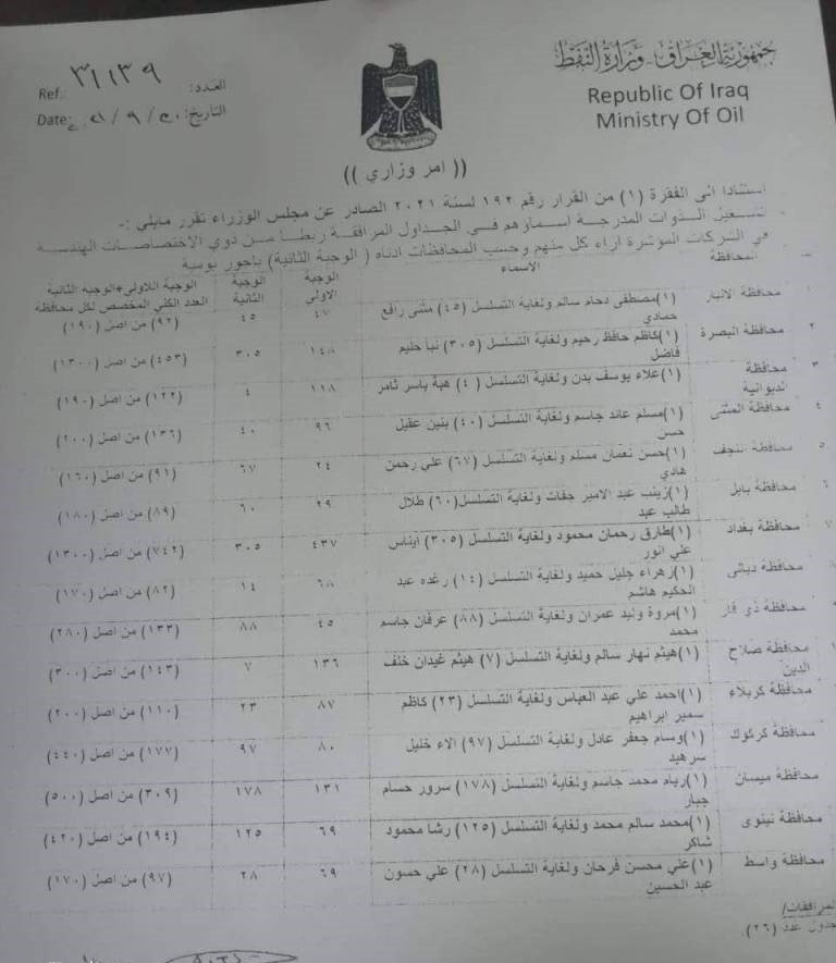 أصدرت وزارة النفط، أمراً وزارياً يتعلق بـ 133 متقدماً من الاختصاصات الهندسية.