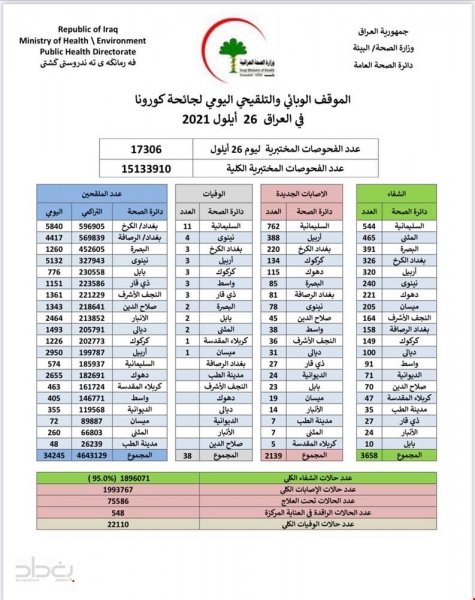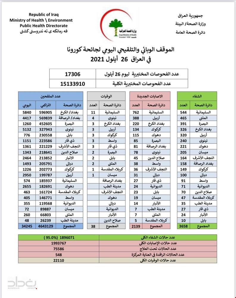 أعلنت وزارة الصحة والبيئة، اليوم الاثنين، الموقف الوبائي اليومي لجائحة كورونا في عموم البلاد.وذكرت الوزارة، في بيان لصحفي، أنها "سجلت 2139 إصابة جديدة بفيروس كورونا، فيما تماثل 3658 من الأشخاص للشفاء".وأضاف البيان أن "حالات الوفاة الجديدة بكورونا بلغت 38 حالة في عموم محافظات البلاد"، لافتا إلى أن "الاشخاص الذين تلقوا اللقاح خلال 24 ساعة بلغ عددهم 34245".![]()