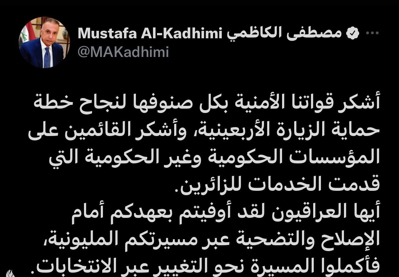 قدم رئيس الوزراء مصطفى الكاظمي، اليوم الثلاثاء، الشكر للقوات الأمنية بنجاح خطة حماية الزيارة الاربعينية.