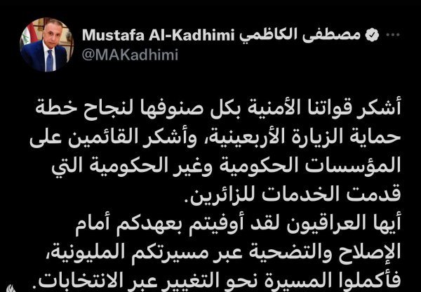 وقال الكاظمي في تغريدة عبر تويتر : "أشكر قواتنا الأمنية بكل صنوفها لنجاح خطة حماية الزيارة الأربعينية، وأشكر القائمين على المؤسسات الحكومية وغير الحكومية التي قدمت الخدمات للزائرين".وخاطب الكاظمي العراقيين بالقول: "لقد أوفيتم بعهدكم أمام الإصلاح والتضحية عبر مسيرتكم المليونية، فأكملوا المسيرة نحو التغيير عبر الانتخابات".![]()