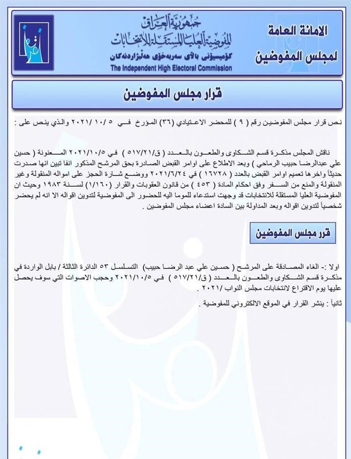 أعلنت المفوضية العليا المستقلة للانتخابات، اليوم الأربعاء، عن إلقاء المصادقة على المرشح عن محافظة بابل حسين رضا عبد العزيز وتحجب أصواته.