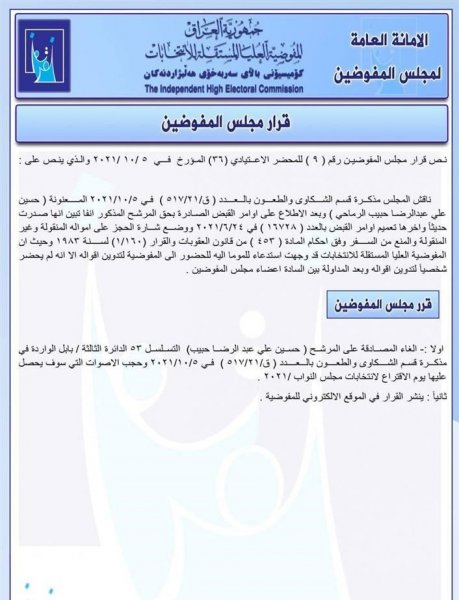 وقالت المفوضية إن "مجلس المفوضين اطلع على أوامر القبض الصادرة بحق المرشح عن محافظة بابل حسين الرماحي وتبين انها صدرت حديثاً".واضاف أن "المفوضية قد وجهت كتاباً للمومأ إليه للحضور إلى مقرها لتدوين أقواله الا انه لم يحضر شخصياً".وأوضح البيان أن "مجلس المفوضين قرر إلغاء المصادقة على المرشح حسين علي عبد الرضا حبيب وحجب الأصوات التي سوف يحصل عليها يوم الاقتراع".![]()
