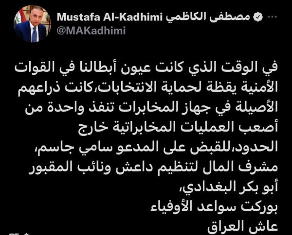 وقال الكاظمي في تغريدة له : "في الوقت الذي كانت عيون أبطالنا في القوات الأمنية يقظة لحماية الانتخابات،كانت ذراعهم الأصيلة في جهاز المخابرات تنفذ واحدة من أصعب العمليات المخابراتية خارج الحدود،للقبض على المدعو سامي جاسم، مشرف المال لتنظيم داعش ونائب المقبور أبو بكر البغدادي".
