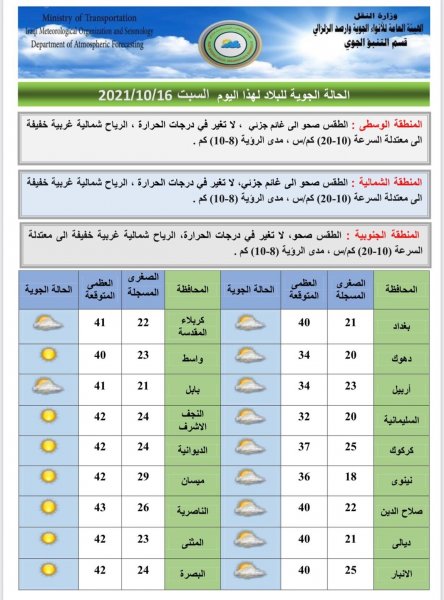 أعلنت هيئة الأنواء الجوية، اليوم السبت، حالة الطقس في البلاد للأيام المقبلة، فيما توقعت أن تكون درجات الحرارة دون الـ 40 مئوية في عموم العراق.