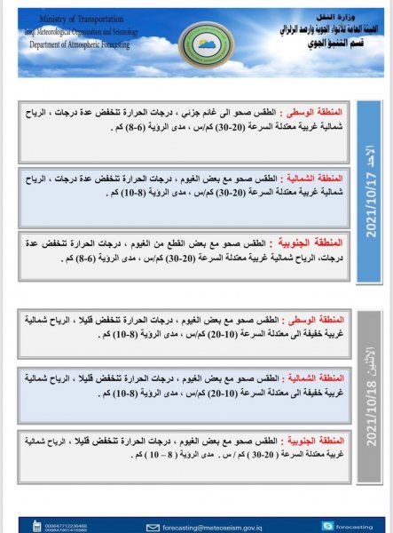 ولفت إلى أن "طقس يوم الأربعاء سيكون صحواً مع بعض الغيوم في المناطق الوسطى، أما الطقس في المناطق الشمالية فسيكون غائماً جزئياً مع فرصة لتساقط زخات مطر خفيفة في أقسامها الشمالية يتحسن تدريجياً نهاراً، أما الطقس في المنطقة الجنوبية فسيكون صحواً، أما درجات الحرارة فستكون مقاربة لليوم السابق في الأقسام الشمالية والوسطى من البلاد، بينما ستنخفض درجات الحرارة قليلاً في القسم الجنوبي".![]()