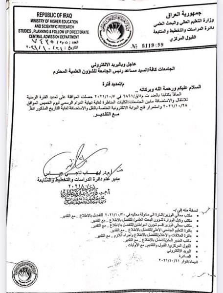 قررت وزارة التعليم العالي تمديد فترة النقل والاستضافة بين الجامعات والكليات الحكومية والاهلية الى 2021/10/28