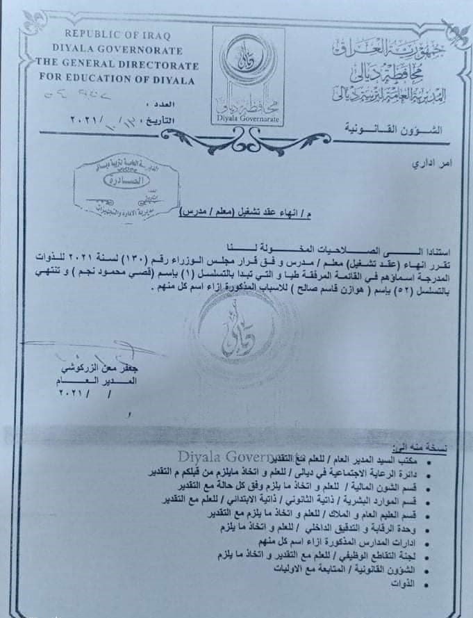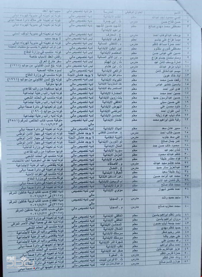 وبحسب الوثائق فان "مديرية تربية ديالى انهت عقد 52 محاضرا بسبب التقاطع الوظيفي".واضافت الوثائق ان "اغلب الذي تم انهاء التعاقد معهم معينين على دوائر اخرى وبعضهم لديه رعاية اجتماعية وبعضهم وبعضهم وصل للسن القانوني للتقاعد وبعضهم منقطع عن العمل و2 متوفين".![]()