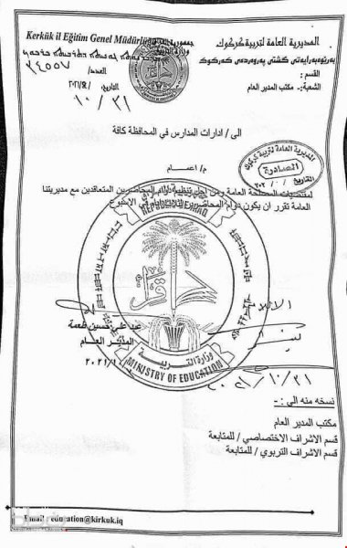 أعلنت مديرية تربية كركوك، اليوم الاحد، أن دوام المحاضرين في مدارس المحافظة سيكون لمدة ثلاثة ايام في الاسبوع.