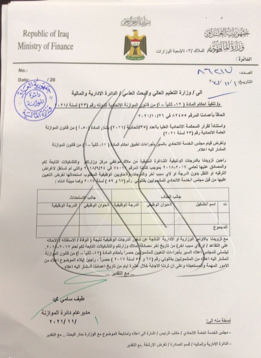 وحصل مصدر صحفي كتاباً صادراً من وزارة المالية خاطبت فيه وزارة التعليم العالي تضمن "تزويدها بالدرجات الوظيفية الشاغرة المتبقية من ملاك موظفي مركز وزارة التعليم والتشكيلات التابعة لهم والتي لم تستغل لأغراض الترقية أو النقل بدون الدرجة أو لأي سبب آخر والدرجات والعناوين الوظيفية المطلوب استحداثها لغرض التعيين عليها من قبل مجلس الخدمة الاتحادي للمشموليين بقانوني رقم (67 و59) لسنة 2017".![]()