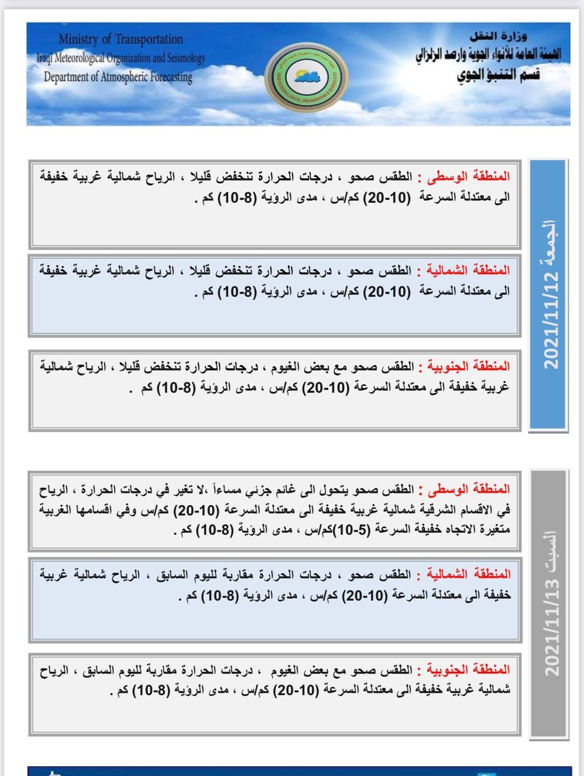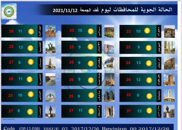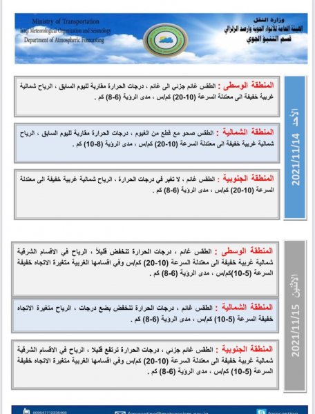 أعلنت هيئة الأنواء الجوية، اليوم الخميس، عن حالة الطقس في البلاد للأيام المقبلة ، فيما توقعت انخفاضاً في درجات الحرارة بدءاً من الغد.