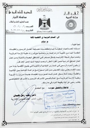 وجهت مديرية تربية محافظة الأنبار، المدارس في الأقضية كافة بالدوام الحضوري من الأحد إلى الخميس، مع الالتزام بإجراءات الوقاية من فيروس كورونا.