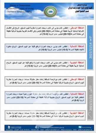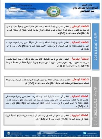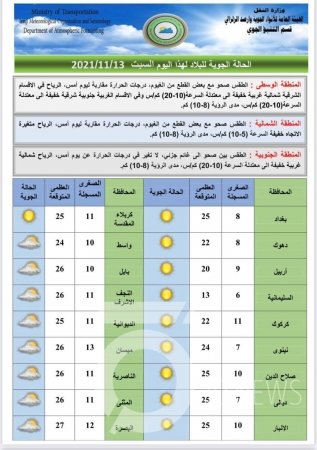 أعلنت هيئة الأنواء الجوية، السبت (13 تشرين الثاني 2021)، عن حالة الطقس في البلاد للأيام المقبلة ، فيما توقعت هطول أمطار رعدية بدءاً من الاثنين.