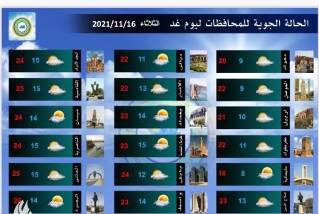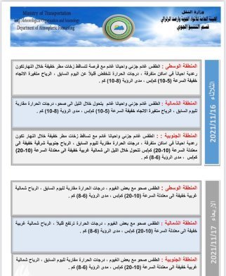أعلنت هيئة الأنواء الجوية، اليوم الإثنين، حالة الطقس في البلاد للأيام القادمة، فيما توقعت انخفاضاً في درجات الحرارة بدءاً من الغد.