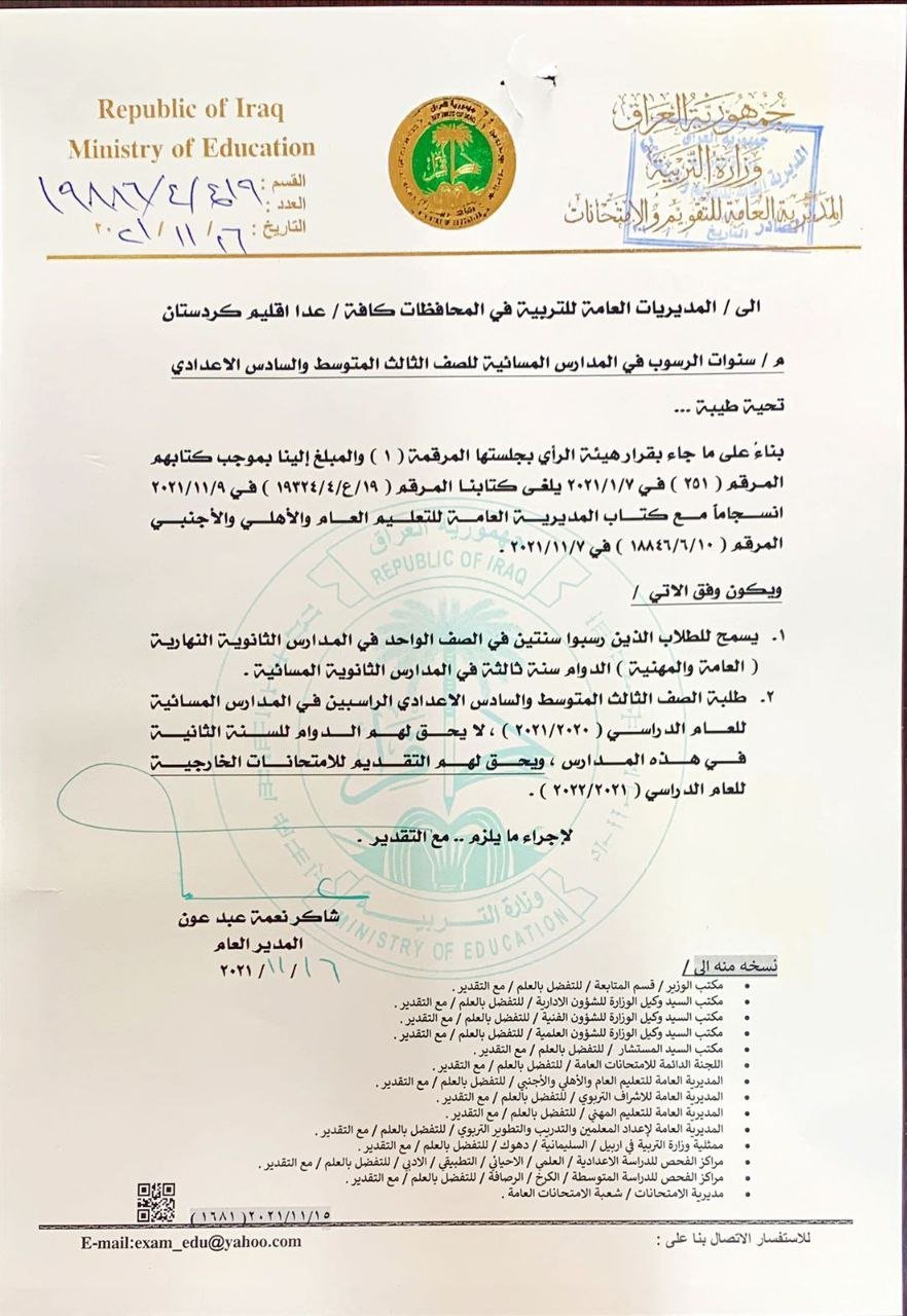 أصدرت وزارة التربية، اليوم الثلاثاء، قراراً بشأن سنوات الرسوب في المدارس المسائية لمرحلتي الثالث متوسط والسادس اعدادي.
