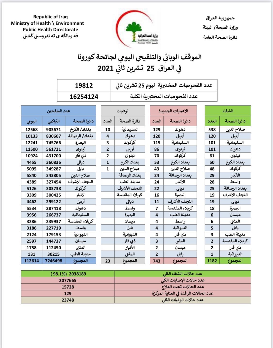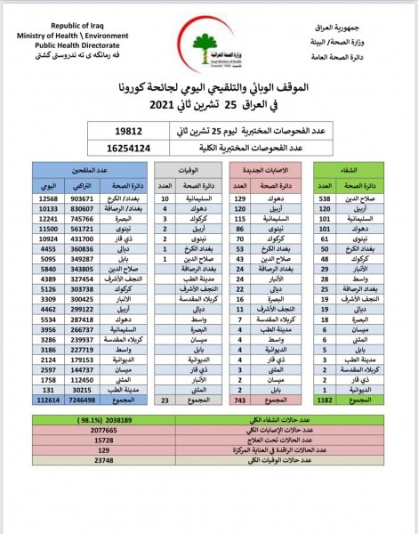 وأضاف البيان، أن "حالات الوفاة الجديدة بكورونا بلغت 23 حالة في عموم محافظات البلاد"، لافتا إلى أن "الاشخاص الذين تلقوا اللقاح خلال 24 ساعة بلغ عددهم 112614".