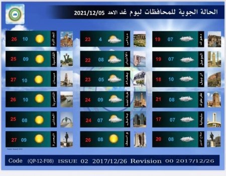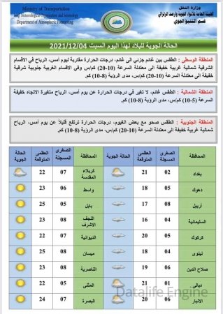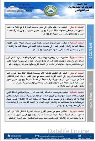 وأظهرت جداول وزارة النقل، (4 كانون الأول 2021)، "الحالة الجوية لهذا اليوم والأيام التي تليه والصادرة من قسم التنبؤ الجوي في الهيئة العامة للانواء الجوية والرصد الزلزالي إحدى تشكيلات وزارة النقل".