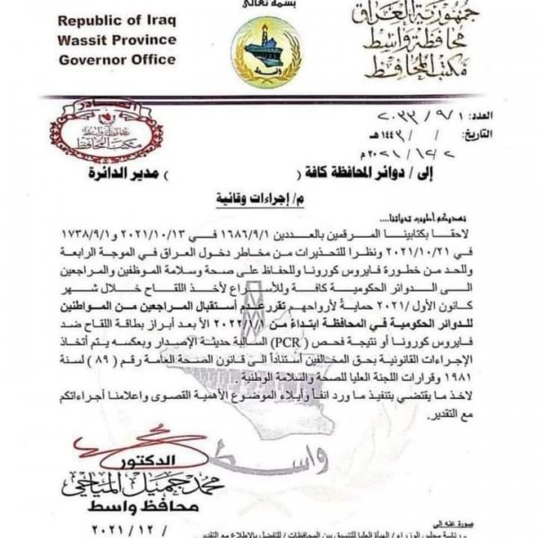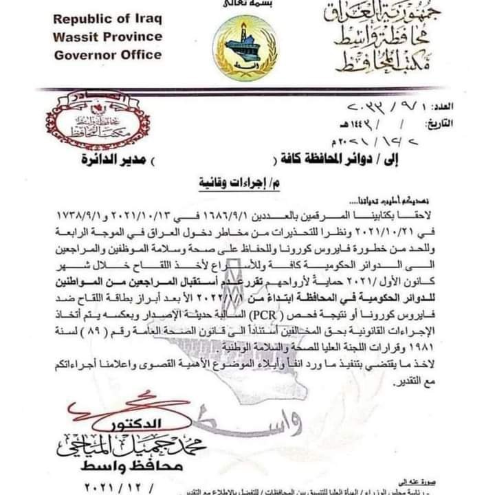 وجاء في كتاب رسمي صدر عن محافظ واسط محمد جميل المياحي إنه "تقرر منع استقبال المواطنين المراجعين الى دوائر الدولة ابتداءً من 1/1/2022 إلَّا بعد إبراز بطاقة اللقاح أو مسحة سالبة حديثة".