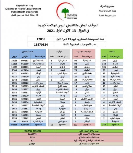 وذكرت الوزارة، في بيان لها أنها "سجلت 522 إصابة جديدة بفيروس كورونا، فيما تماثل 783 من الأشخاص للشفاء". وأضاف البيان أن "حالات الوفاة الجديدة بكورونا بلغت 16 حالة في عموم محافظات البلاد"، لافتا إلى أن "الاشخاص الذين تلقوا اللقاحخلال 24 ساعة بلغ عددهم 92198". ![]()
