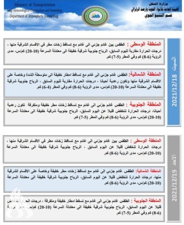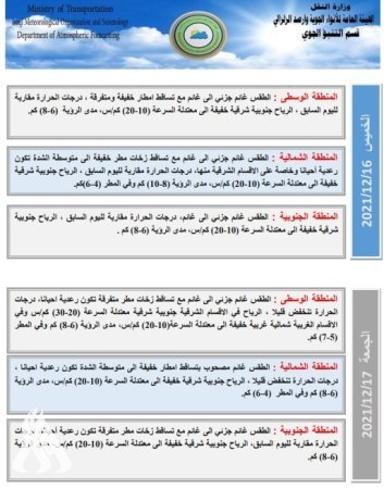 أعلنت هيئة الأنواء الجوية، اليوم الأربعاء، عن حالة الطقس للأيام المقبلة، فيما توقعت انخفاضاً في درجات الحرارة بدءاً من الجمعة.