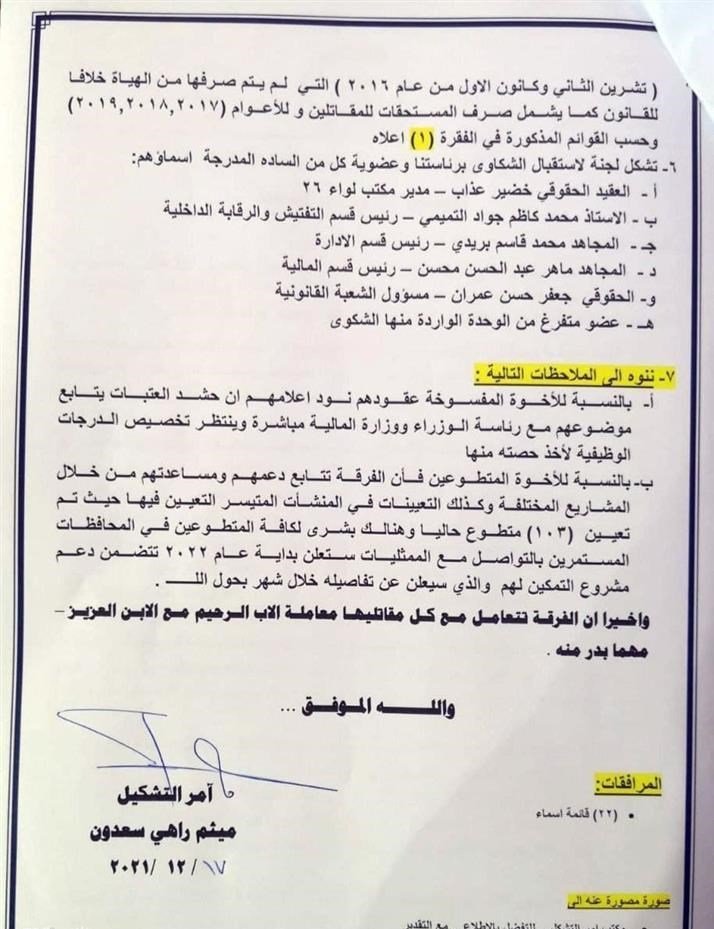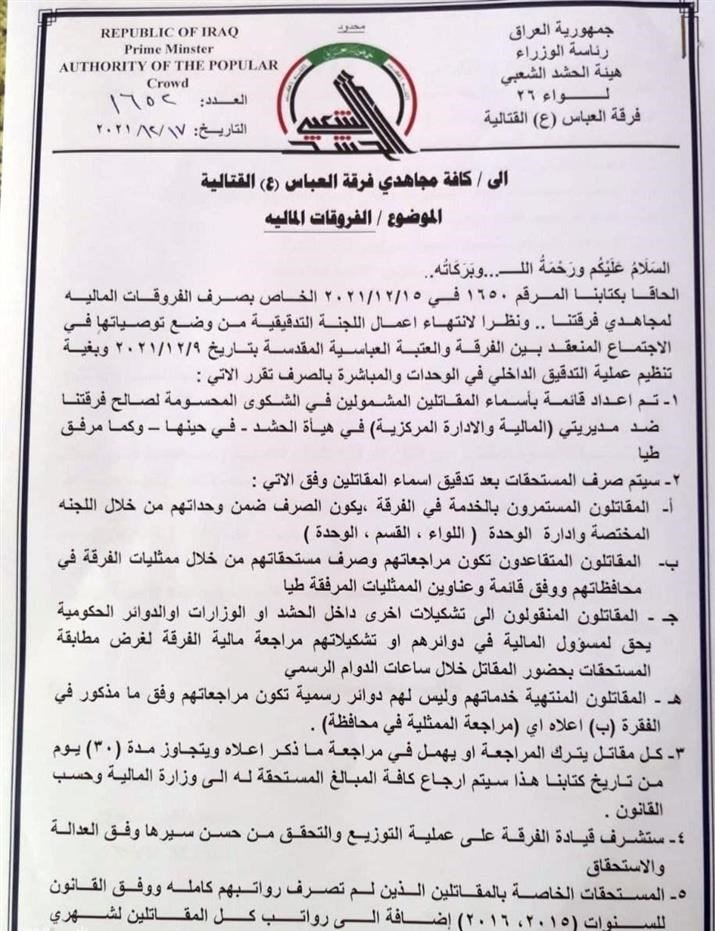 اصدرت فرقة العباس القتالية، تعليمات بشأن إجراءات صرف الفروقات المالية بعد الاعتصامات الاخيرة داخل مقر الفرقة.وجاء في وثيقة بهذا الخصوص ما هو نصه: