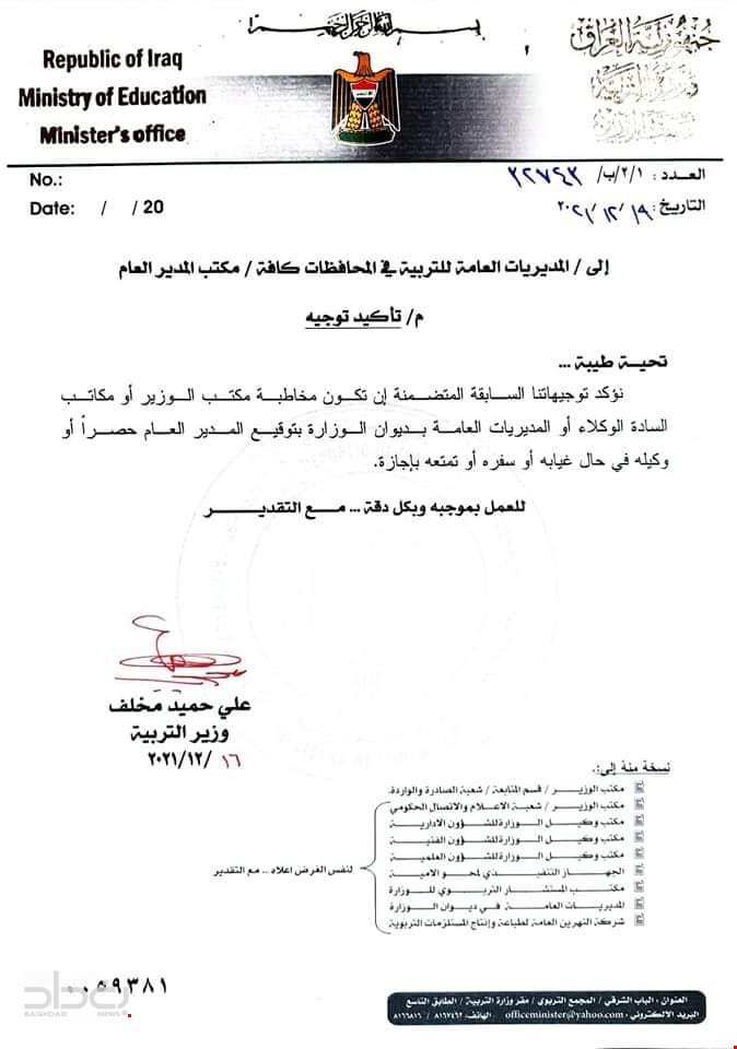 أصدر وزير التربية، علي حميد خلف، اليوم الاحد، توجيها بشأن توقيعات المديرين العامين.ادناه نص الوثيقة: