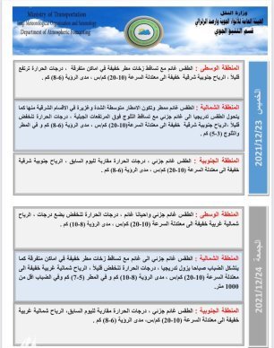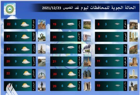 أعلنت هيئة الأنواء الجوية، اليوم الأربعاء، عن حالة الطقس في العراق للأيام المقبلة، فيما توقعت ارتفاعاً في درجات الحرارة بدءاً من يوم غد الخميس.