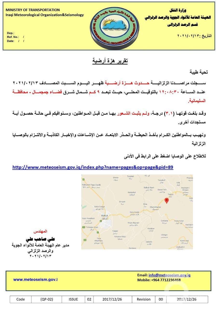 وذكرت الوزارة في بيان لها أن "الهزة سجلت في تمام الساعة 11:49:24 مساء يوم الأحد بالتوقيت المحلي وقد بلغت قوتها (3) درجة حيث تبعد ( 34) كم جنوب غرب قضاء كفري من محافظة ديالى".