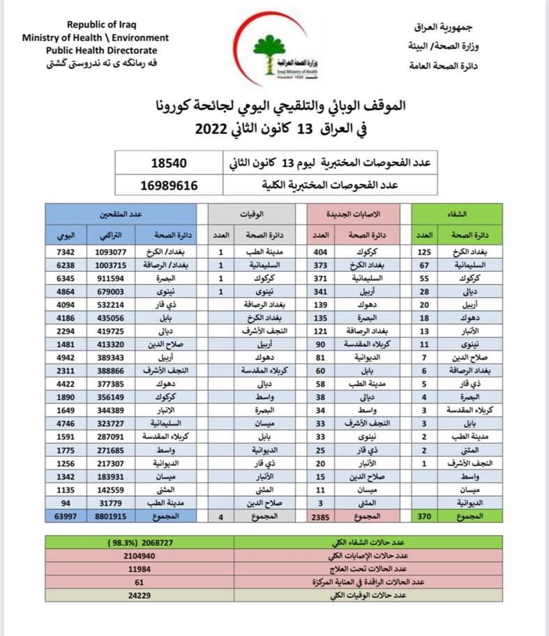 وذكرت الوزارة، في بيان لها أنها "سجلت 2385 إصابة جديدة بفيروس كورونا، فيما تماثل 370 من الأشخاص للشفاء". وأضاف البيان أن "حالات الوفاة الجديدة بكورونا بلغت 4 حالات في عموم محافظات البلاد"، لافتا إلى أن "الاشخاص الذين تلقوا اللقاح خلال 24 ساعة بلغ عددهم 63997".![]()