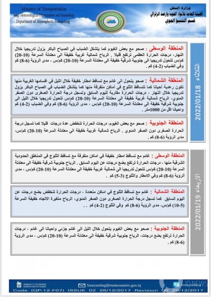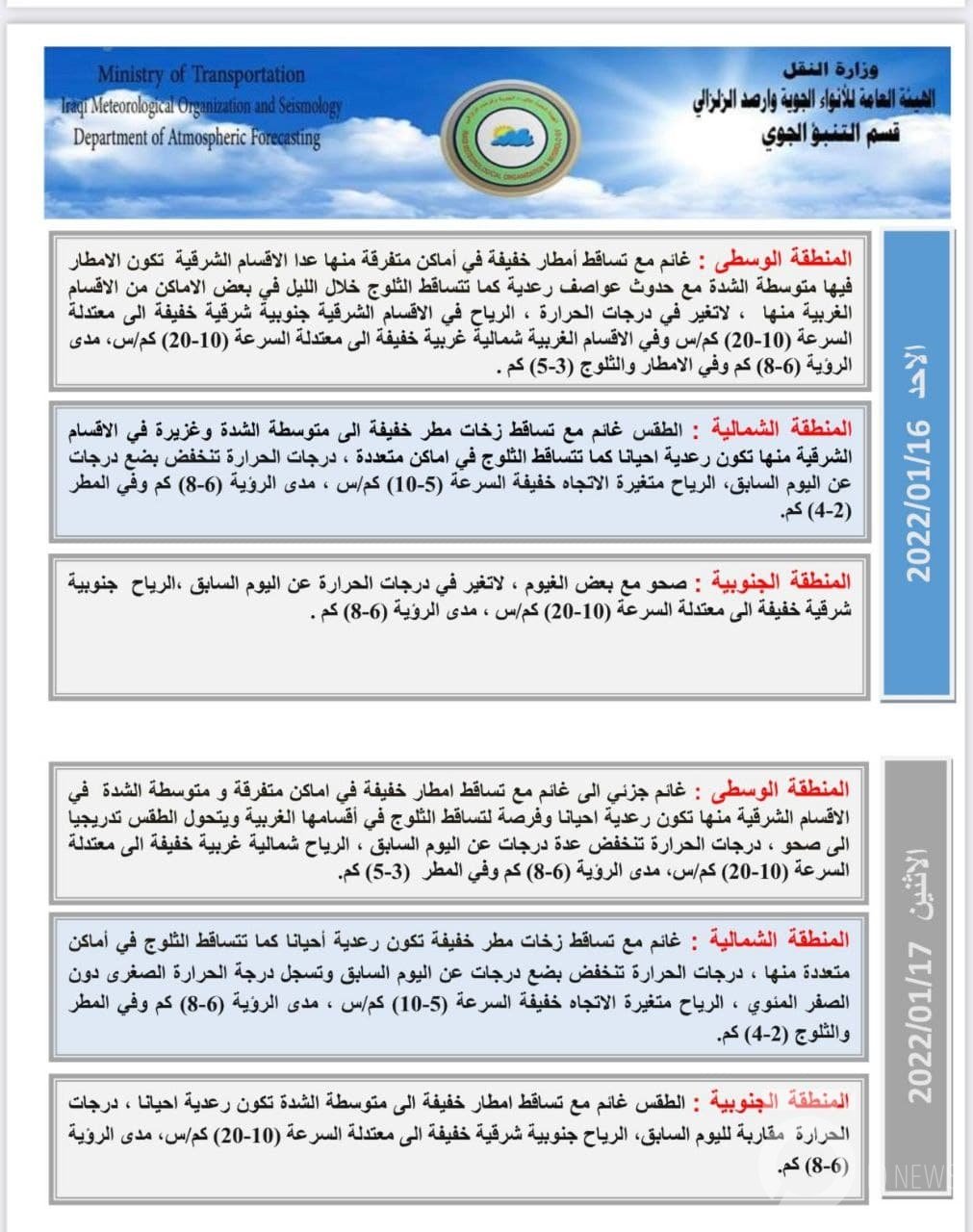 توقعت هيئة الأنواء الجوية، السبت (15 كانون الثاني 2022) حالة الطقس في البلاد للأيام المقبلة، فيما توقعت هطول أمطار وتساقط الثلوج بدءاً من يوم غد الاحد.