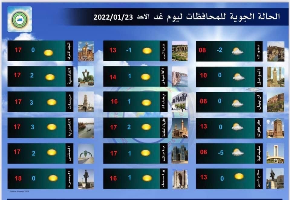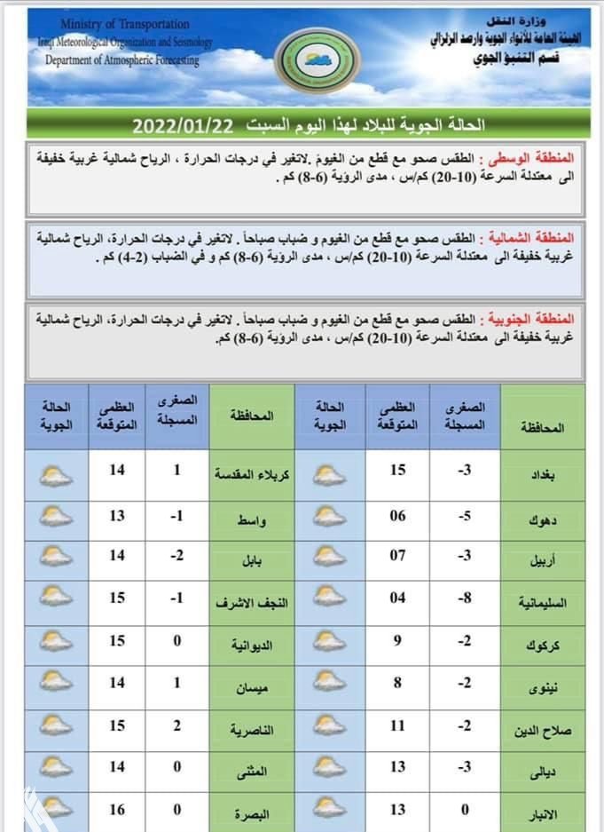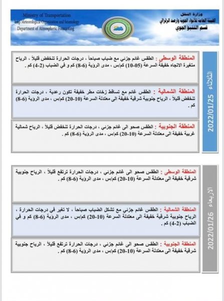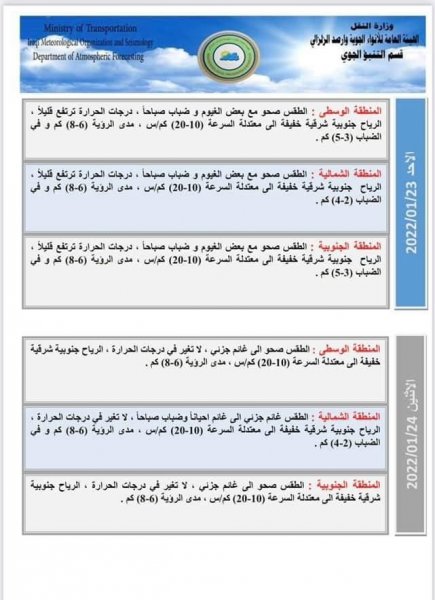 أعلنت هيئة الأنواء الجوية، اليوم السبت، عن حالة الطقس في البلاد للأيام المقبلة، فيما توقعت ارتفاع درجات الحرارة بدءاً من يوم غد.