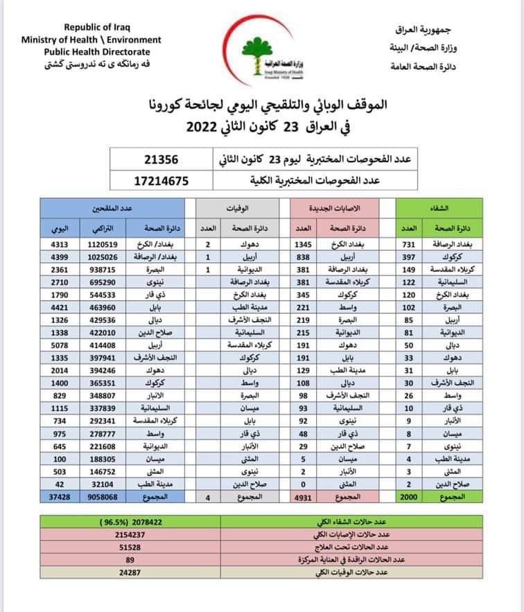 وقالت الوزارة في بيان الموقف الوبائي، ان "عدد الاصابات المسجلة في عموم العراق خلال 24 ساعة الماضية بلغت 4931 اصابة فيما بلغ عدد الوفيات 4 حالات وفاة بالوباء". واضافت انها "سجلت اكثر من 2000 حالة شفاء في عموم العراق تتصدرها محافظة بغداد الرصافة بنحو 731 حالة شفاء في وقت بلغ عدد الذين تلقوا اللقاح 37428 متلقي في عموم البلاد".![]()