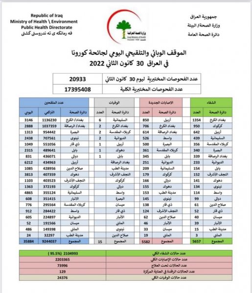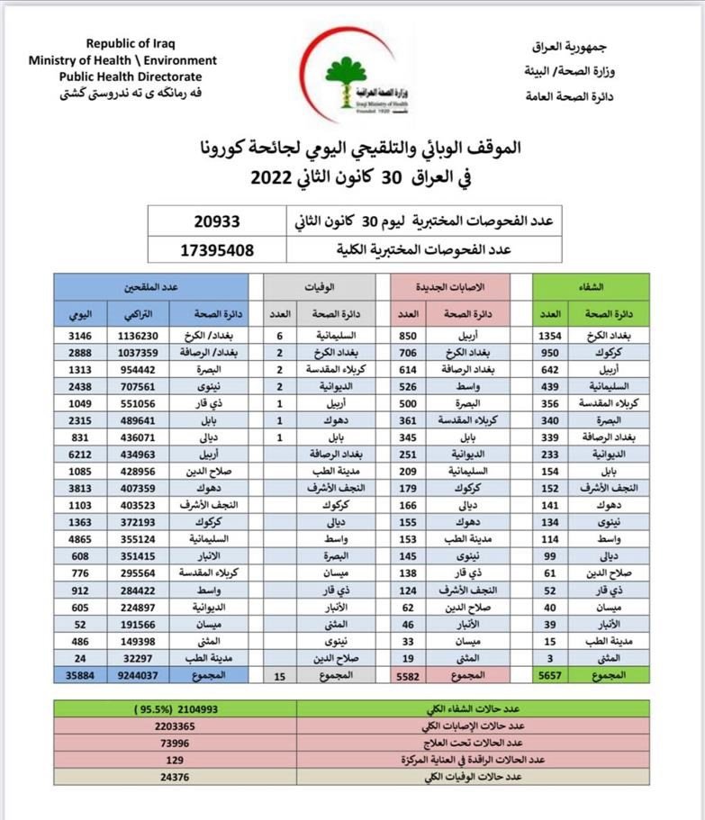 وذكرت الوزارة، في بيان لها أنها "سجلت 5582 إصابة جديدة بفيروس كورونا، فيما تماثل 5657 من الأشخاص للشفاء".وأضاف البيان أن "حالات الوفاة الجديدة بكورونا بلغت 15 حالات في عموم محافظات البلاد"، لافتا إلى أن "الاشخاص الذين تلقوا اللقاح خلال 24 ساعة بلغ عددهم 35884".![]()