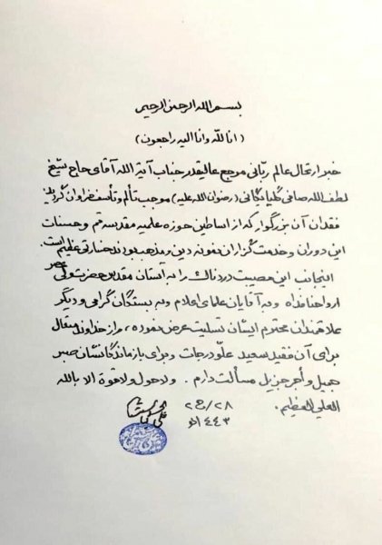 قدم المرجع الديني الأعلى السيد علي السيستاني، اليوم الثلاثاء، التعازي برحيل المرجع الديني آية الله العظمى الشيخ لطف الله الصافي الكلبايكاني. وأدناه نص التعزية: