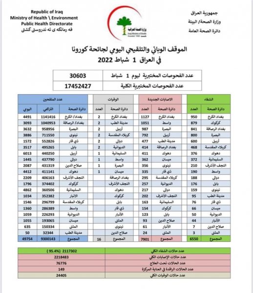 وذكرت الوزارة، في بيان لها أنها "سجلت 7901 إصابة جديدة بفيروس كورونا، فيما تماثل 6550 من الأشخاص للشفاء".وأضاف البيان أن "حالات الوفاة الجديدة بكورونا بلغت 16 حالة في عموم محافظات البلاد"، لافتا إلى أن "الاشخاص الذين تلقوا اللقاح خلال 24 ساعة بلغ عددهم 49754".![]()