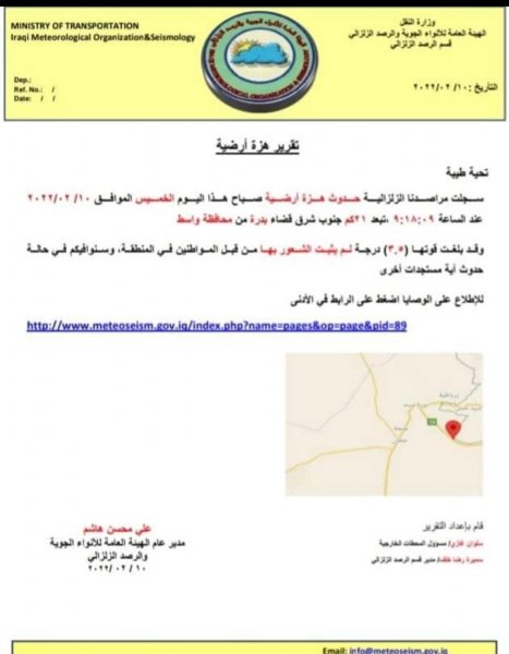 وذكرت الهيئة في بيان لها أن "الهزة سجلت في تمام الساعة 09:18:09 صباح اليوم بالتوقيت المحلي وقد بلغت قوتها (3،5) درجات وتبعد 21 كم جنوب شرق قضاء بدرة في محافظة واسط".