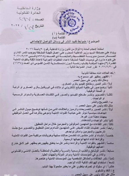 اصدرت وزارة الداخلية، اليوم الاحد، ضوابط لتقييد نشر منتسبيها بمواقع التواصل الاجتماعي ومنها منع التصوير بالثكنات وإبداء المواقف السياسية.