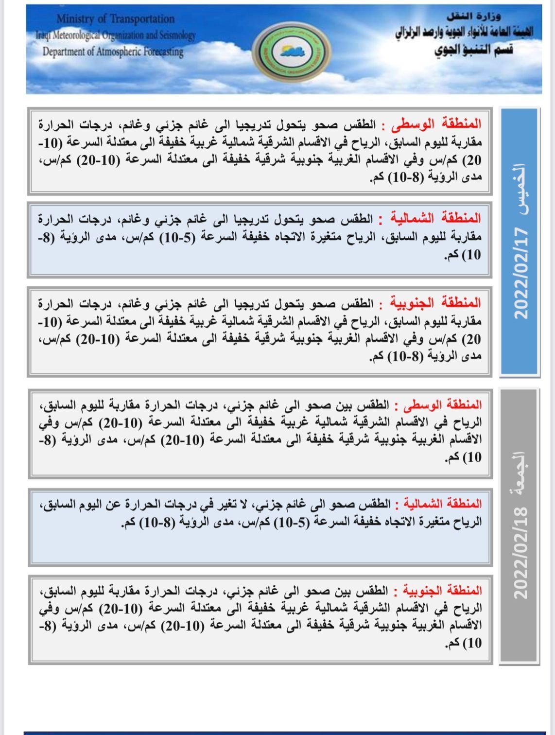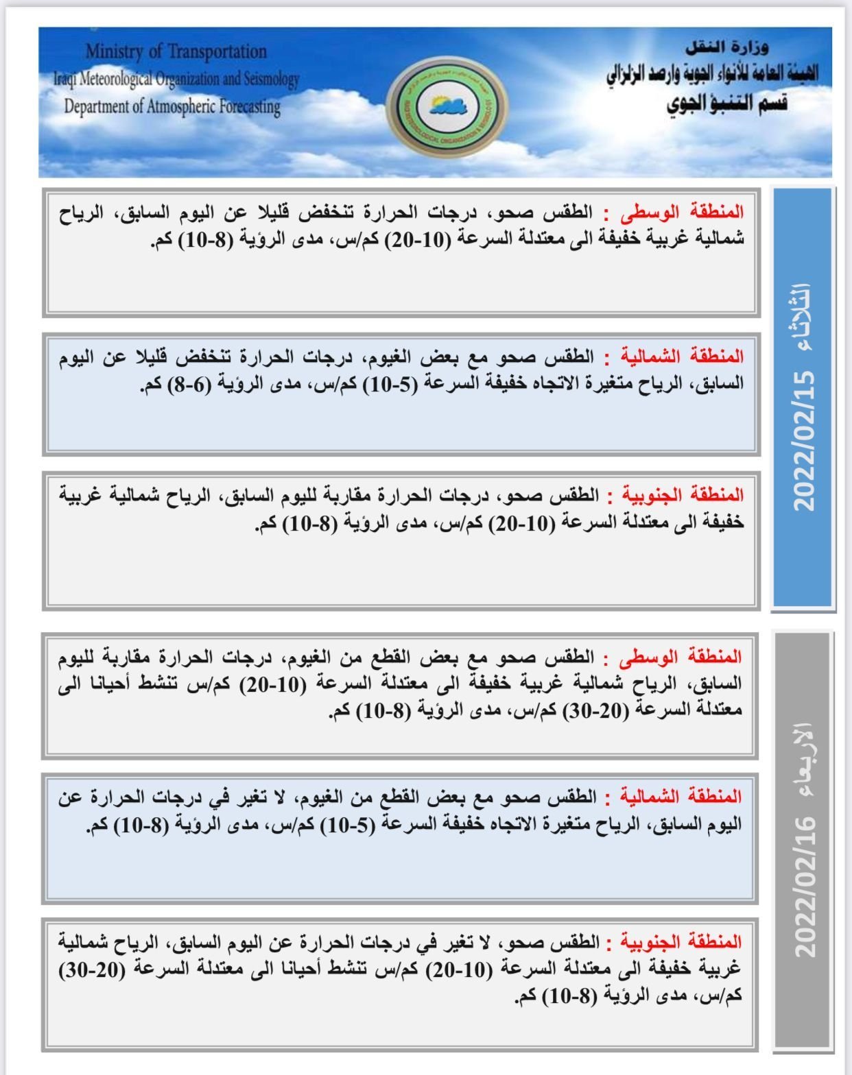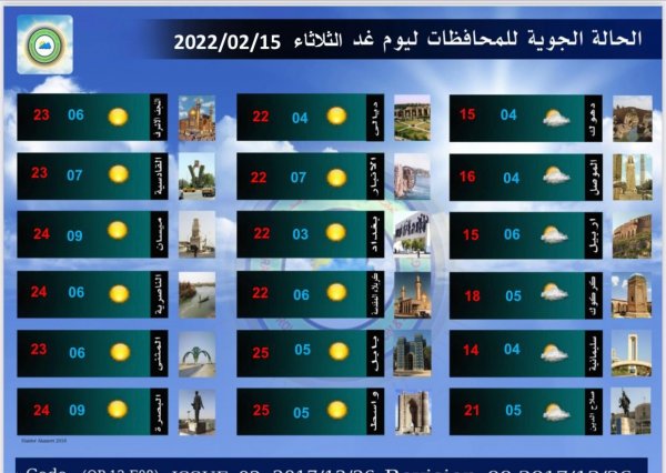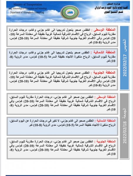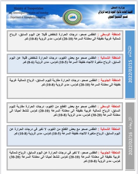 أعلنت هيئة الانواء الجوية، اليوم الاثنين، عن حالة الطقس للأيام المقبلة، فيما توقعت انخفاض في درجات الحرارة بدءاً من الغد.