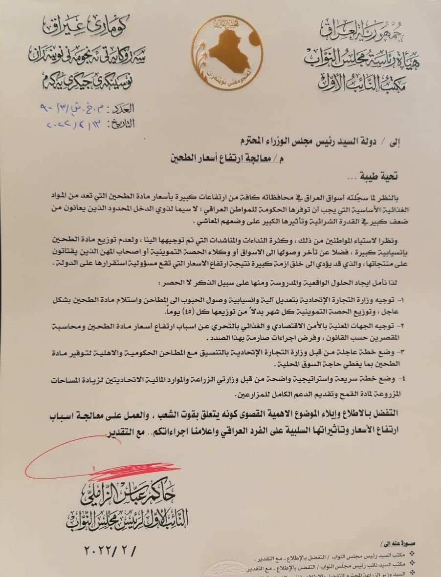وقال المكتب الاعلامي للنائب الأول في بيان إن "الزاملي طالب رئيس الوزراء مصطفى الكاظمي بالتحرك العاجل للوقوف على أسباب الارتفاع الكبير بأسعار مادة الطحين، وتأثيرها المباشر على القدرة الشرائية والوضع المعاشي لذوي الدخل المحدود".