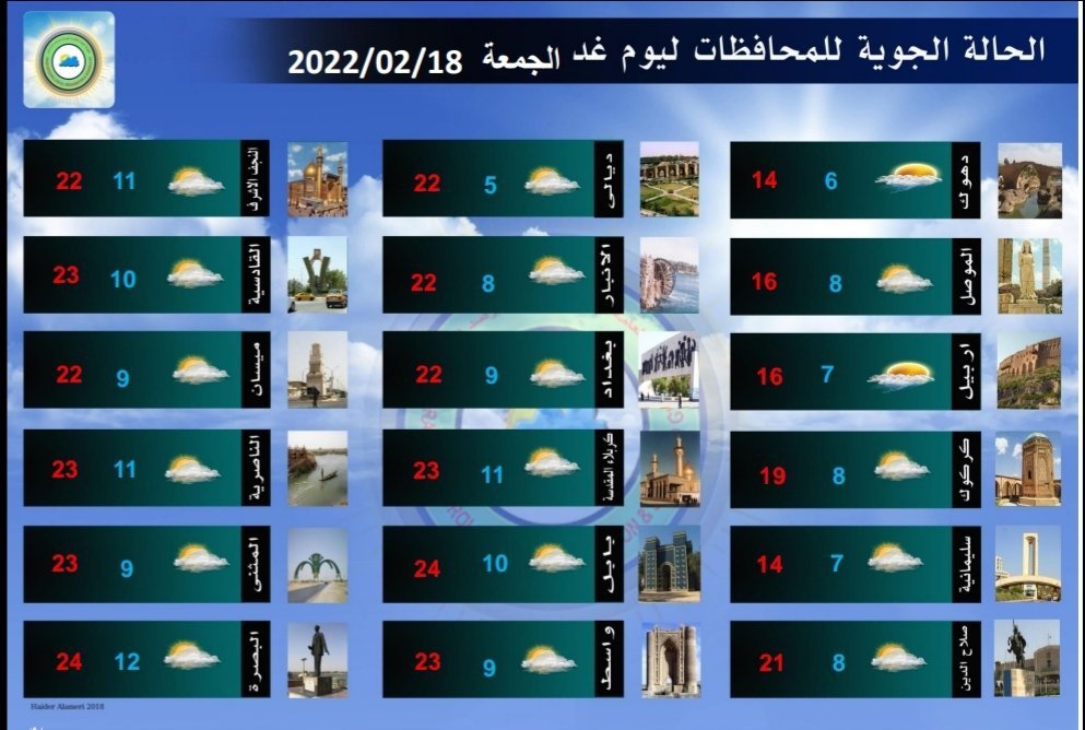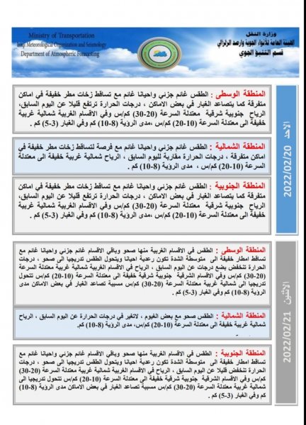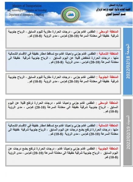 أعلنت هيئة الأنواء الجوية، اليوم الخميس، عن حالة الطقس في البلاد للأيام المقبلة، فيما توقعت تساقط أمطار وتصاعد للغبار الأسبوع المقبل.