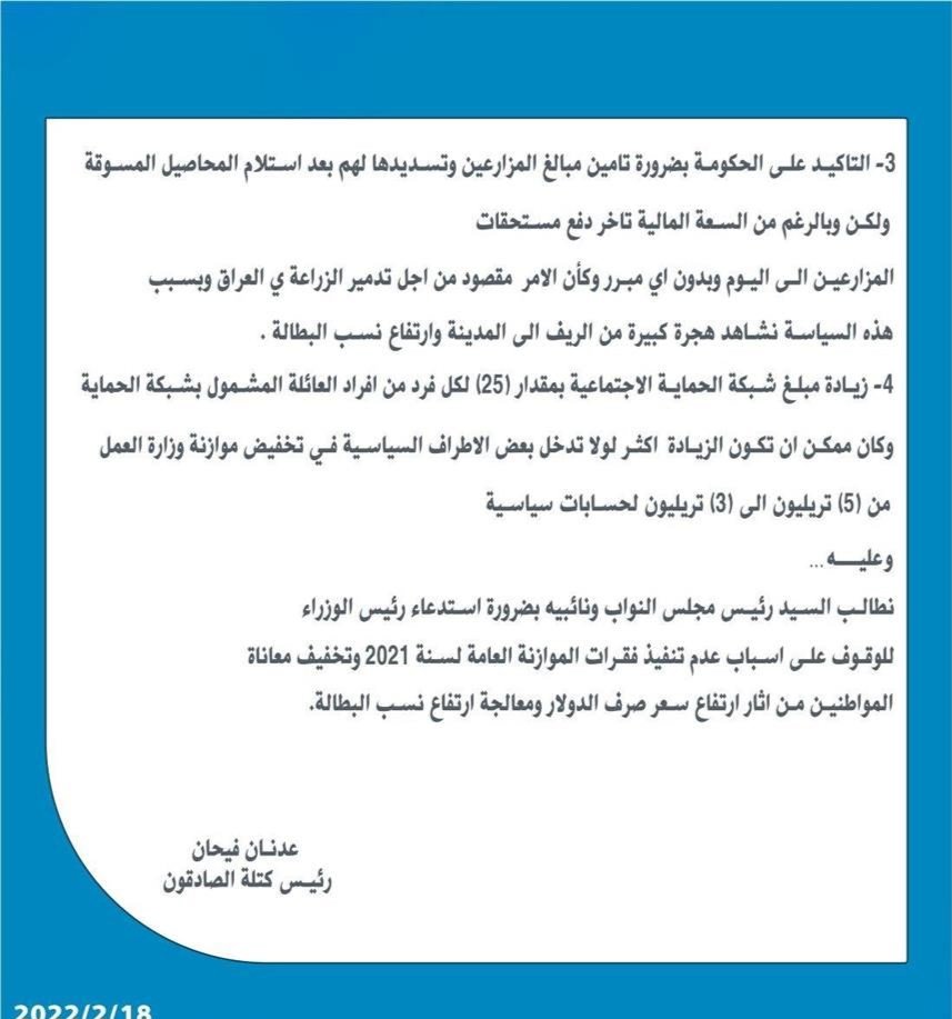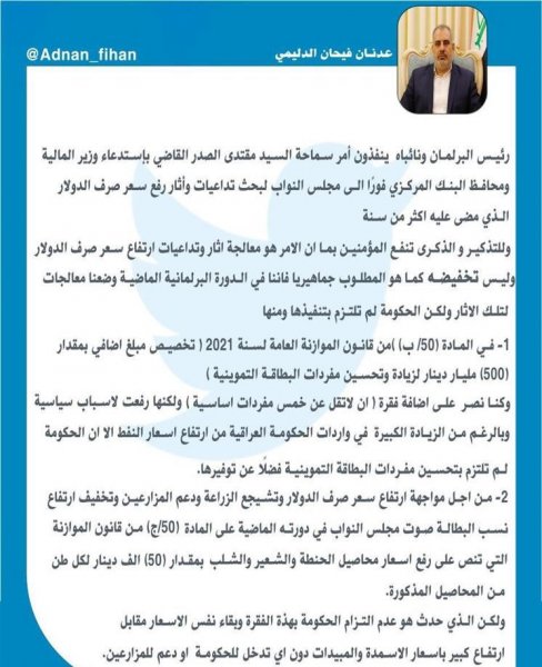 أكد رئيس كتلة صادقون، عدنان فيحان الدليمي، اليوم الجمعة، وجود تحرك برلماني لاستدعاء، رئيس مجلس الوزراء، مصطفى الكاظمي، تحت قبة مجلس النواب بخصوص اسعار الدولار. ادناه نص تغريدة الدليمي: