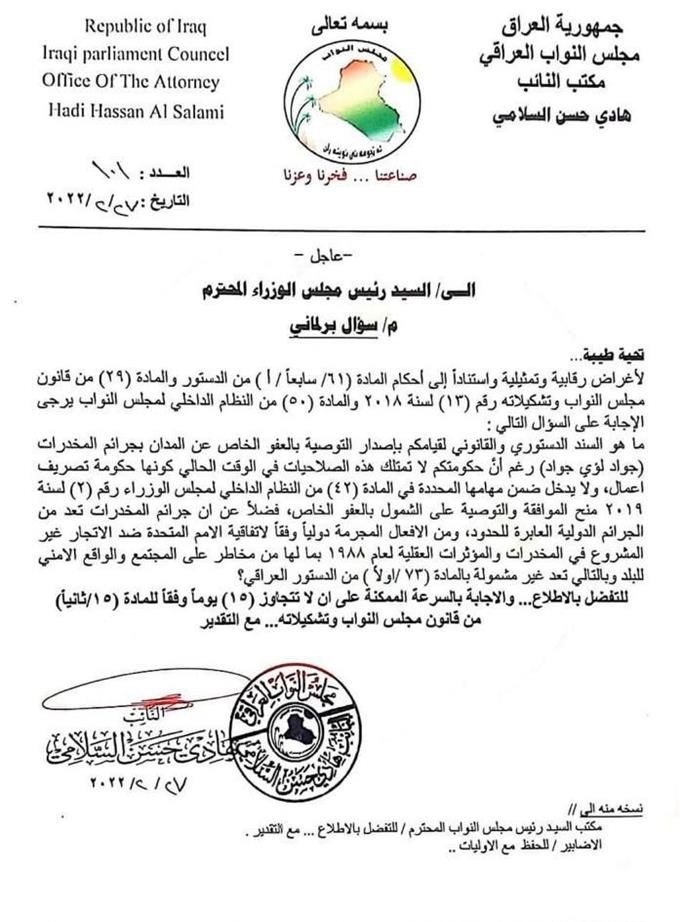 بالوثيقة.. سؤال برلماني للكاظمي بشأن العفو عن تاجر مخدرات