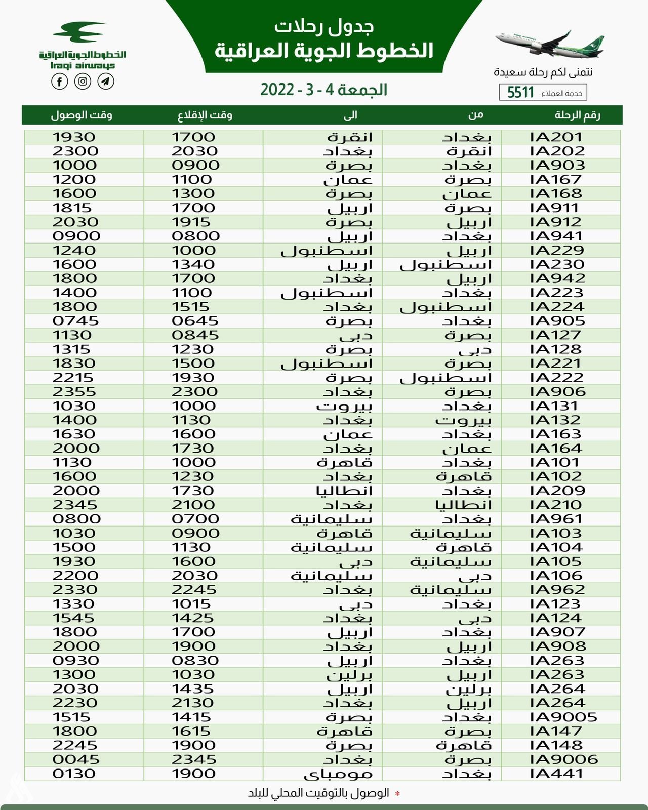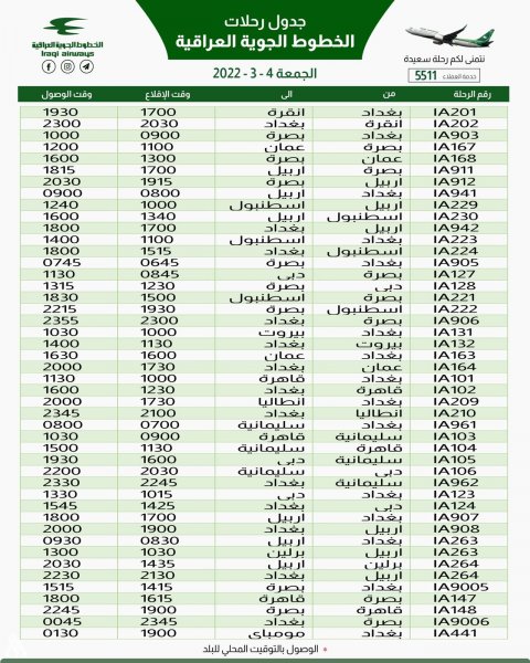 أعلنت الخطوط الجوية العراقية، اليوم الخميس، عن جدول رحلاتها ليوم غد الخميس.