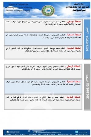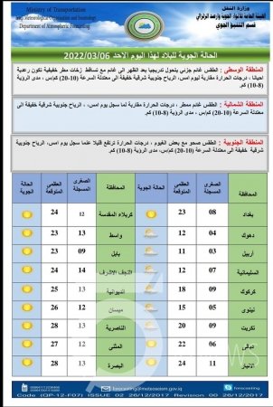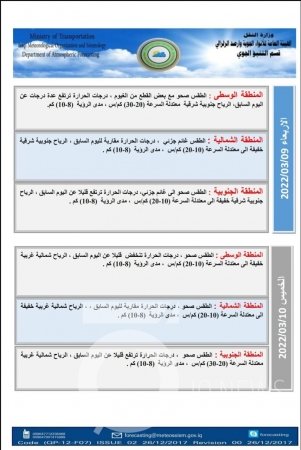 توقعت هيئة الأنواء الجوية، حالة الطقس لليوم الأحد (6 آذار 2022)، والأيام الاربعة المقبلة، وفيما لفتت إلى أن درجات الحرارة تستمر بالارتفاع تدريجيا حتى نهاية الأسبوع، أشارت إلى فرصة لتساقط أمطار خفيفة اليوم في المنطقة الوسطى.