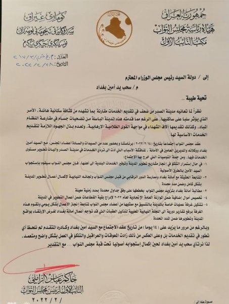 وأشار الزاملي بحسب الوثيقة الى انه "بالرغم من مرور مايزيد عن 14 يوماً من تاريخ عقد الاجتماع مع امين بغداد وكادره المتقدم لم نلحظ أي تطور في تقديم الخدمات بل على العكس من ذلك زادت المعوقات والتلكؤ في العمل بشكل واضح ومتعمد لذا نطلب سحب يد امين بغداد لحين اكمال استجوابه اصولياً تحت قبة مجلس النواب"