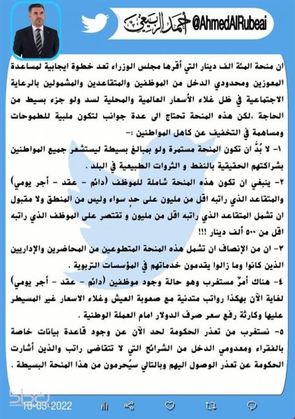 وقال الربيعي في تغريدة له ان "منحة المئة ألف دينار التي أقرها مجلس الوزراء تعد خطوة إيجابية لمساعدة المعوزين ومحدودي الدخل من الموظفين والمتقاعدين والمشمولين بالرعاية الاجتماعية في ظل غلاء الأسعار العالمية والمحلية لسد ولو جزء بسيط من الحاجة".