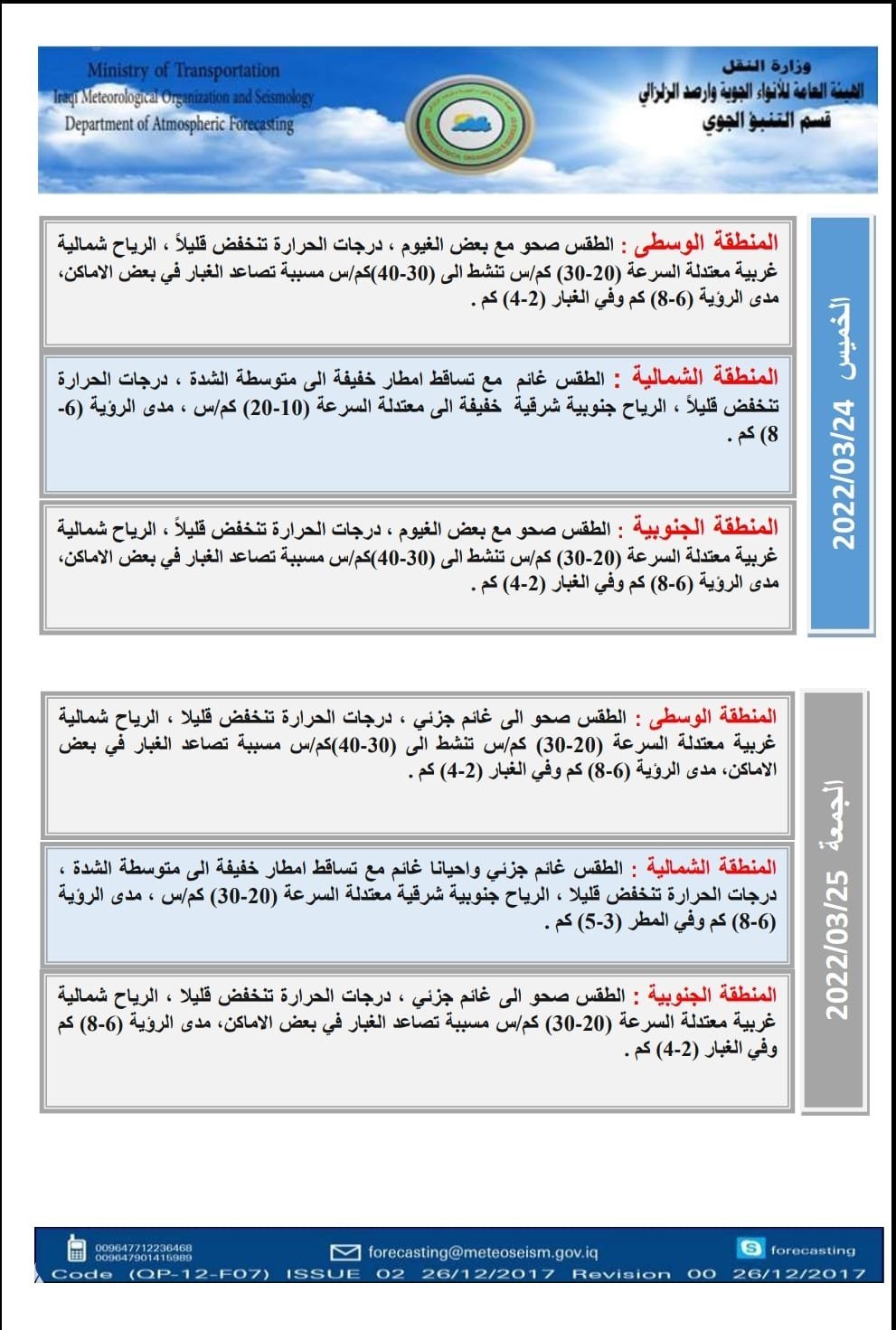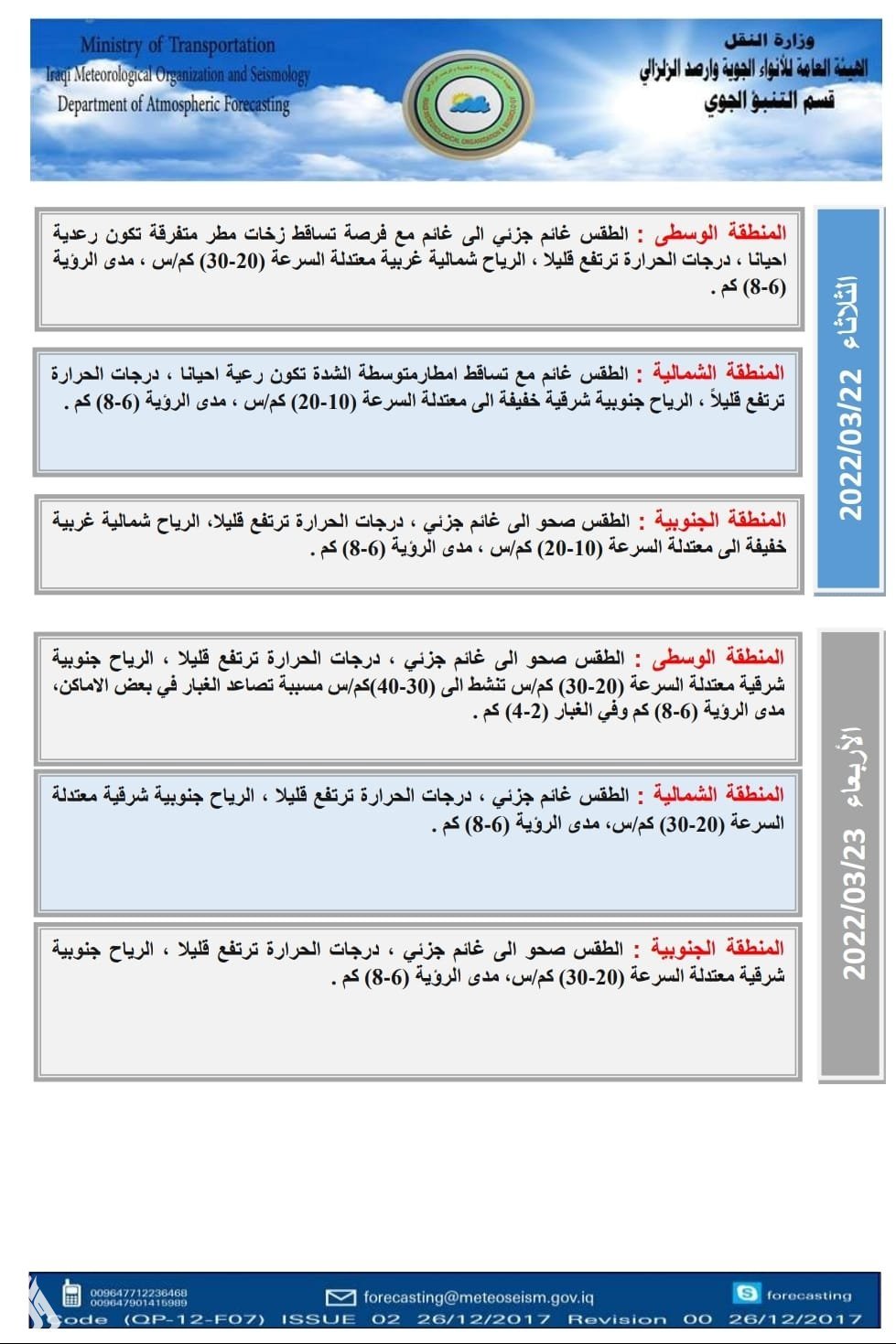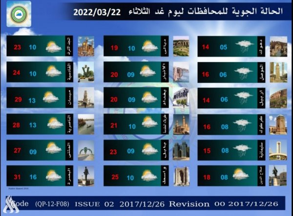 أعلنت هيئة الأنواء الجوية، اليوم الاثنين، عن حالة الطقس في البلاد للأيام المقبلة، فيما توقعت تساقط أمطار بشكل متفاوت مع انخفاض في درجات الحرارة.