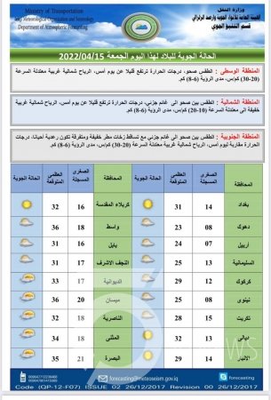 نشرت هيئة الأنواء الجوية، الجمعة، (15 نيسان، 2022)، حالة الطقس، خلال اليوم والأيام الأربعة المقبلة، مبينة أن درجات الحرارة سترتفع بشكل يومي خلال هذه الأيام، بالإضافة إلى أجواء صحوة مع غيوم متفرقة بأغلب الأوقات.